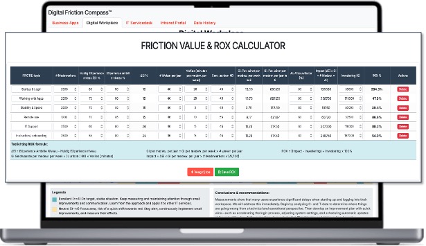 Reducing digital friction improves experience — but leadership needs to understand the financial impact. Our Friction Value Calculator translates friction into measurable business value. By combining reported time loss, workflow inefficiencies and operational data with realistic productivity benchmarks, it quantifies how digital friction affects performance, support costs and Return On IT Experience investments. (ROX) Instead of assumptions, you gain clear insight into how much productivity is lost over time, which friction drivers create the highest cost, and where improvements will generate the strongest return.